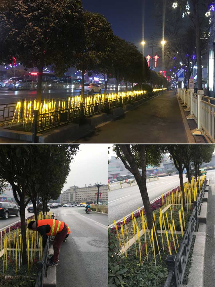 簡(jiǎn)介—— 西安蓮湖區(qū)2019年元旦、春節(jié)亮化工程。項(xiàng)目包括鐘鼓樓燈光花籃雕塑,郵政廣場(chǎng)亮化、北大街主干道的亮化。采用了麥穗插地?zé)?、郁金香插地?zé)?、芙蓉花插地?zé)?、小品燈球、串燈等多款造型燈具,共同打造出北大街沿線的夜景風(fēng)光。