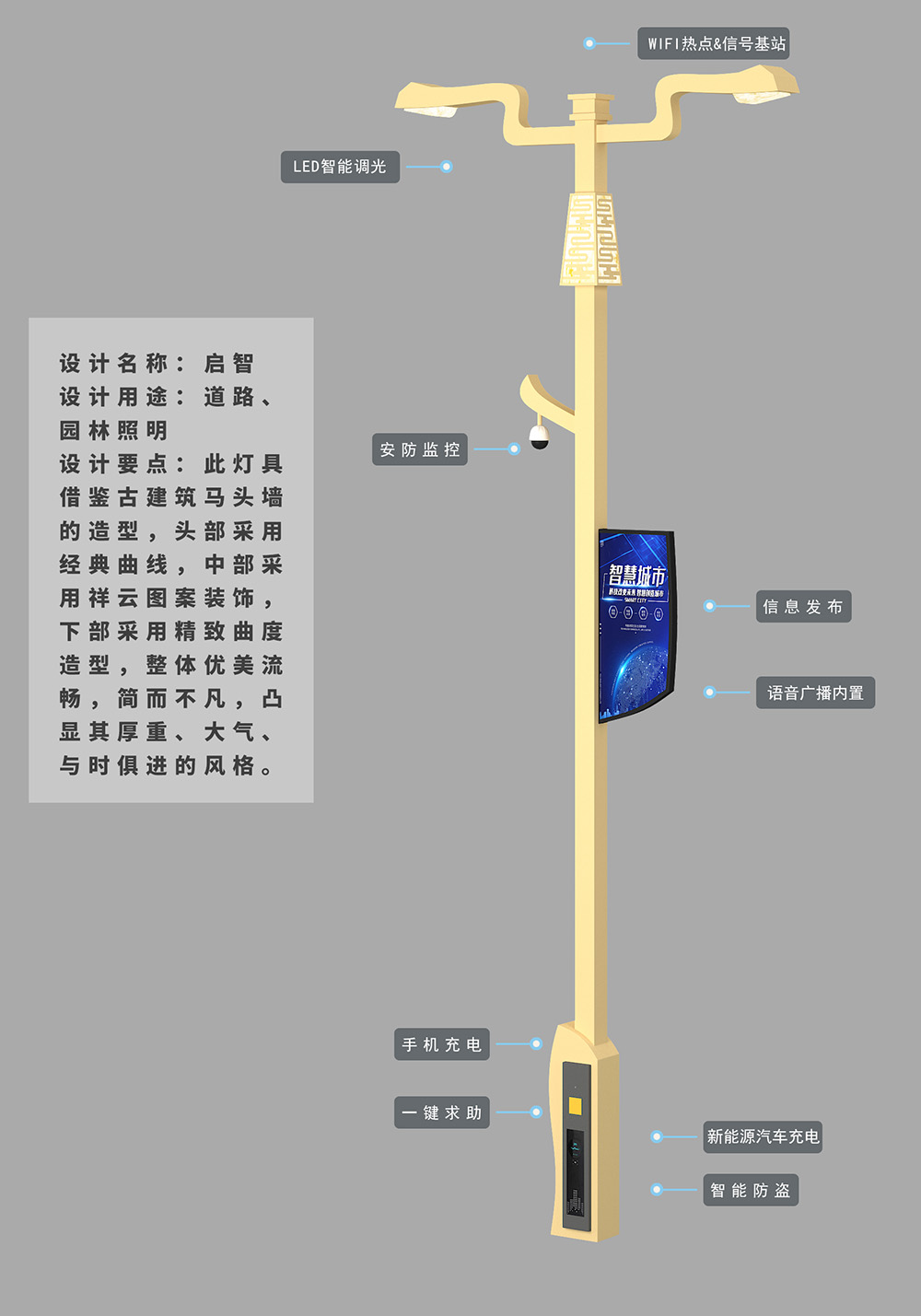 設(shè)計要點:此燈具借鑒古建筑馬頭墻的造型,頭部采用經(jīng)典曲線,中部采用祥云圖案裝飾,下部采用精致曲度造型,整體優(yōu)美流暢,簡而不凡,凸顯其厚重、大氣、與時俱進的風格。