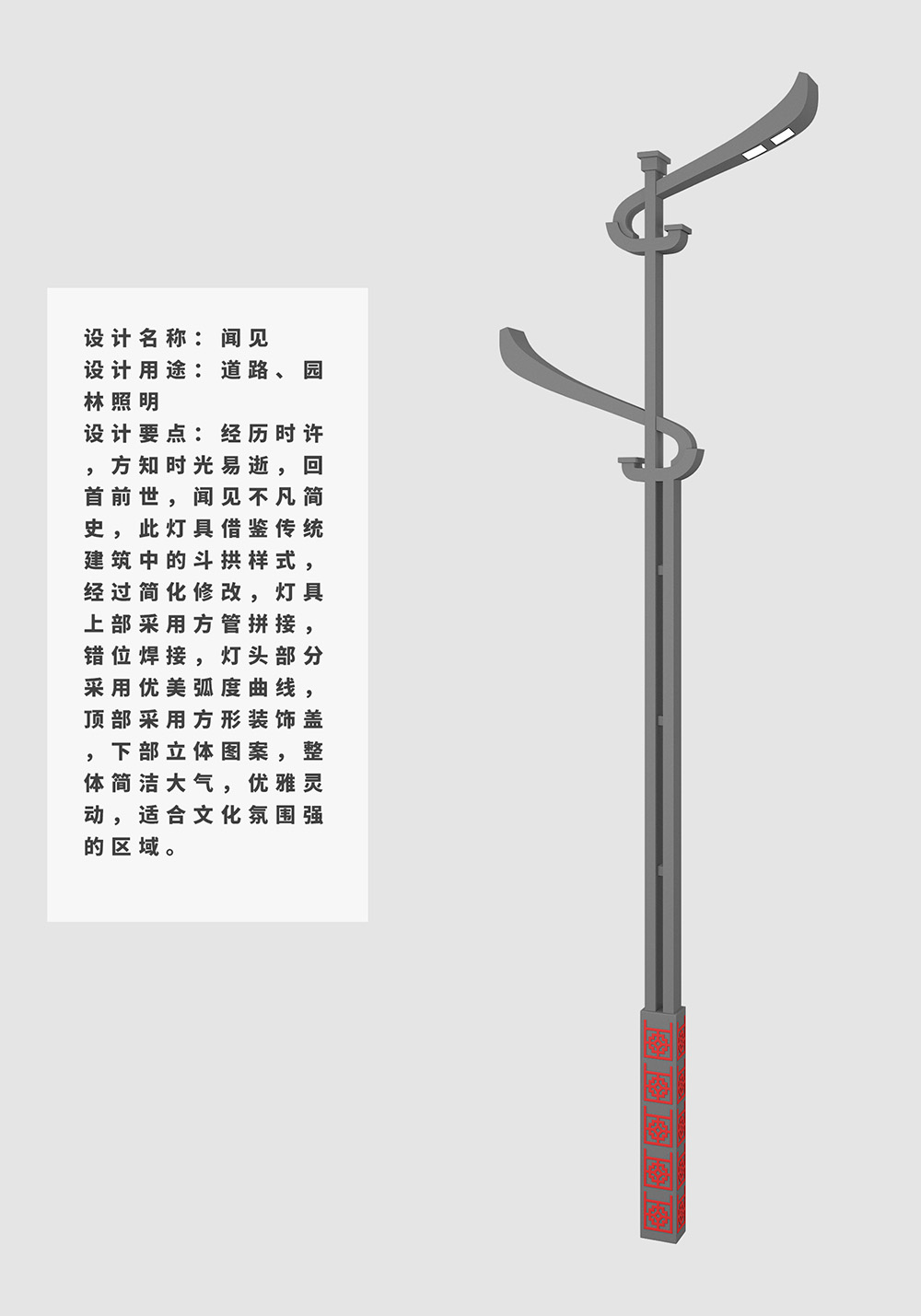 設(shè)計(jì)要點(diǎn):經(jīng)歷時(shí)許,方知時(shí)光易逝,回首前世,聞見(jiàn)不凡簡(jiǎn)史,此燈具借鑒傳統(tǒng)建筑中的斗拱樣式,經(jīng)過(guò)簡(jiǎn)化修改,燈具上部采用方管拼接,錯(cuò)位焊接,燈頭部分采用優(yōu)美弧度曲線(xiàn),頂部采用方形裝飾蓋,下部立體圖案,整體簡(jiǎn)潔大氣,優(yōu)雅靈動(dòng),適合文化氛圍強(qiáng)的區(qū)域。